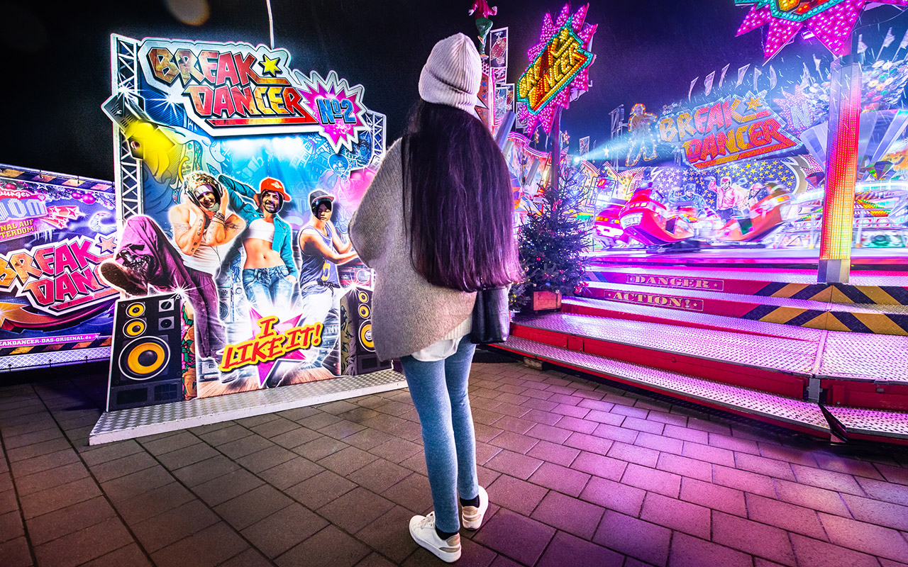 begeistern der „Original Break Dancer“ und der „Break Dancer No. 2“ alle, die mit ihnen gefahren sind! Atemberaubende Geschwindigkeit in Verbindung mit cooler Musik lassen Raum und Zeit für einen Moment vergessen. Eines der erfolgreichsten Rundfahrgeschäfte aller Zeiten hat weltweit viele Nachahmer gefunden (über 100!), aber das authentischste Feeling gibt´s NUR HIER!